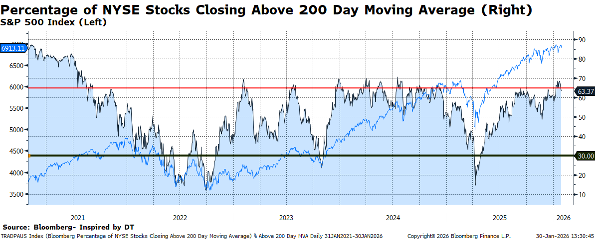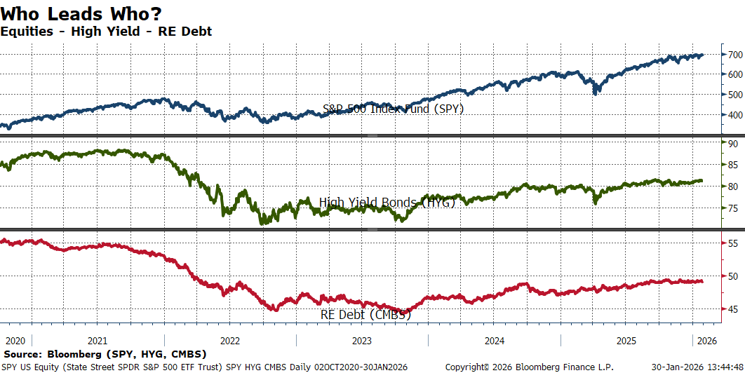 Top Panel/Blue = SPY; Middle Panel/Green = HYG; Bottom Panel/Red = CMBS. As of 1/30/2026.