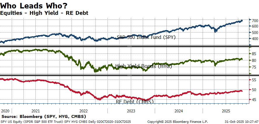 Top Panel/Blue = SPY; Middle Panel/Green = HYG; Bottom Panel/Red = CMBS. As of 10/31/2025.