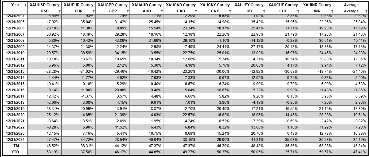Performance of Gold in Major Currencies - % Change